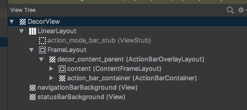 使用AS自带的tools/layout inspector可以看出,整个DecorView包含了三部分:navigationBarBackground为导航栏,statusBarBackground为状态栏,LinearLayout为当中内容部分,展开LinearLayout.FrameLayout,可以得到action_bar_container即actionbar或toolbar和content(R.id.content)即真正setContentView的目标。