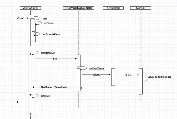KeyframeSet.ofFloat() 会把我们传入的 values 转化为一组 FloatKeyframe(因为我们传入的是一组 float ) 。Keyframe 翻译一下就叫『关键帧』。顾名思义,代表动画执行过程中某些特殊的帧,例如开始、结束。以及一些中间重要状态。如果我们传入的 values 只有 1 个元素,KeyframeSet 则存放两个『关键帧』分别表示 0~values[0]。如果我们传的 values 有多余 1 个元素,怎会生成 values.length -1 个关键帧。每个关键帧之间过度,就是所谓的『动画』,每次动画都会触发 Evaluator.evaluate 的变动,然后 FloatPropertyValuesHolder 创建部分完毕,一层一层向上返回。(O__O "…,如果忘记这个部分在哪,可以往上翻去看看),然后执行 ObjectAnimator.setValues() ,ObjectAnimator 直接调用了父类的ValueAnimator.setValues()