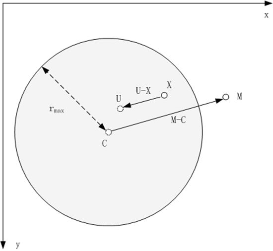 看上图,这个坐标系对应着我们 Android 屏幕上的绘图坐标,点 C 就是我们手指触摸按下的坐标点,半径为 rmax 的圆形范围就是我们要平滑变形的区域,当我们在 C 位置按下屏幕并拖动到点 M 位置时,半径为 rmax 的变形区域内的每一个像素点将按照上述提及的算法公式进行位移,效果就是点 U 移动到点 X 的位置。所以,关键就是找到上面这个变换的逆变换——给出点 X 时,可以求出它变换前的坐标 U,然后用变化前图像在 U 点附近的像素进行插值,求出U的像素值。如此对圆形选区内的每一个像素进行求值,便可得出变换后的图像。在这里,就是求出点 U 的在 verts 数组对应的坐标值,并将此坐标值赋给 X 点在 verts 数组对应的元素,然后重新绘制,就可以得到我们想要的变形后的图像。