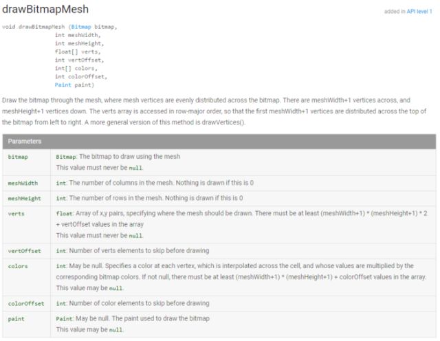 先来看看 Android API 中对 drawBitmapMesh 方法的介绍: