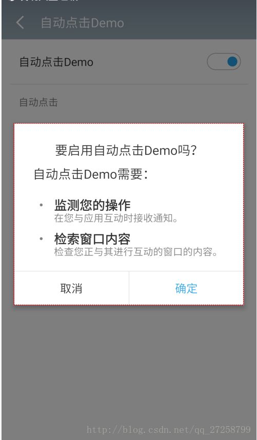 <?xml version="1.0" encoding="utf-8"?> <service android:name=".AutoClickService" android:exported="false" <!-- label就是在手机设置中的无障碍里,显示的标签 --> android:label="自动点击Demo" <!-- 注意这里的android:permission是在service结构里面的!! --> android:permission="android.permission.BIND_ACCESSIBILITY_SERVICE" > <intent-filter> <action android:name="android.accessibilityservice.AccessibilityService" /> </intent-filter> <!-- 配置服务服务配置文件路径 --> <meta-data android:name="android.accessibilityservice" android:resource="@xml/accessible_service_config" /> </service>