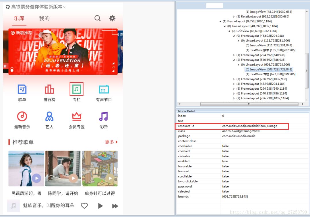 这里我们拿魅族手机自带的音乐 App 做例子,假如我们需要自动点击下图的专栏 :