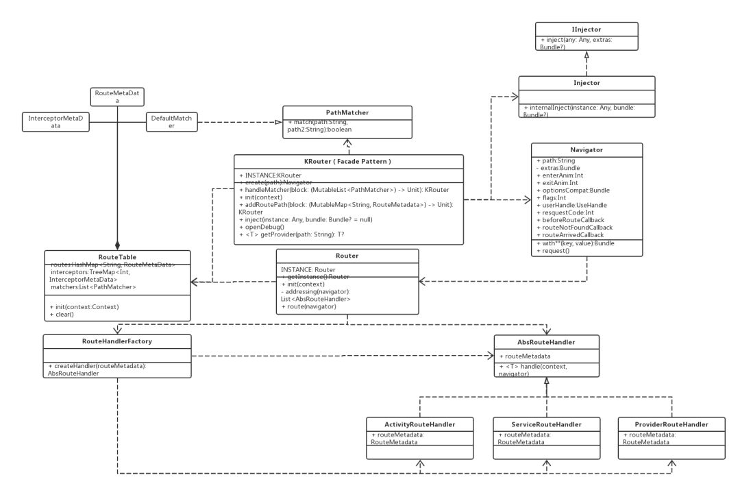 原理很简单,KRouter-compiler模块生了初始化路由表的代码,这些路由表内部其实就是一个个map,这些map以路径path作为key,数据类作为value(比如RouteMetadata),SDK内部会通过path获取到数据类,像开头启动Activity的例子中,SDK就通过path获取到一个RouteMetadata对象,在这个对象中取出被注解的类的Class<*>,有了这个Class<*>就可以完成启动Activity的操作。