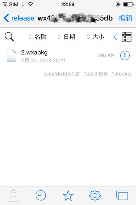 找到“微信”的目录(我手机上对应的是:297286CE-9055-400A-99FA-D2D7C0735DCF 文件夹),点击进入,即为微信在此 iPhone 上的“沙盒”(Sandbox),相信 iOS 开发者对此目录已经非常熟悉了,该目录下主要有 Documents、Library 和 tmp 等文件夹,通常用于存放不同的数据和文件,这里不再赘述。我们在当前微信“沙盒”目录中搜索 wxapkg 关键字,即可找到当前 iPhone 中微信已下载的小程序包,如下图: