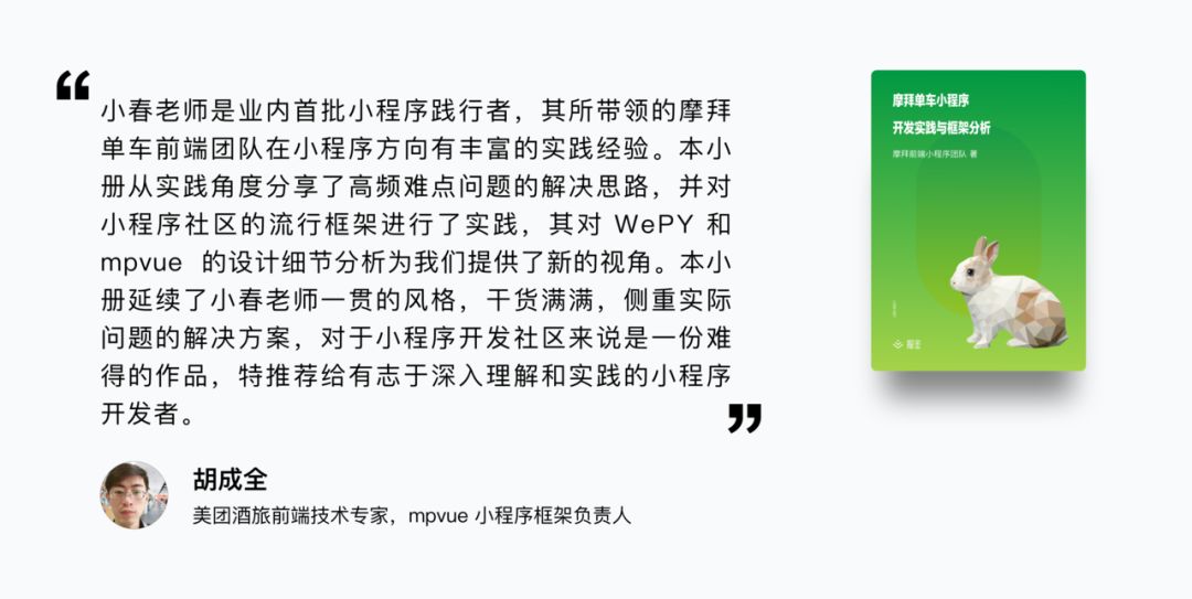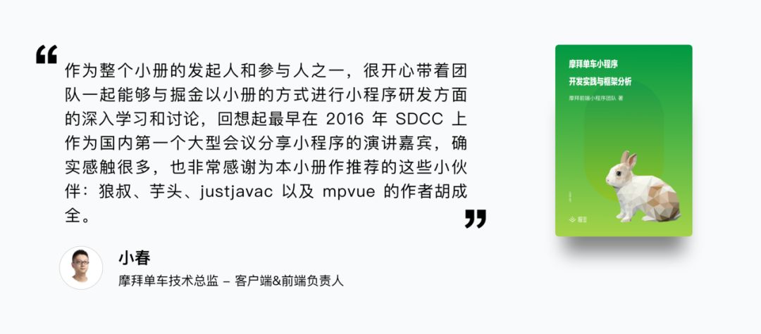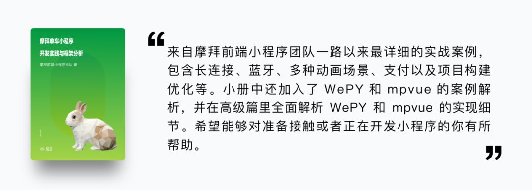 这本小册是由摩拜前端小程序团队的多名前端开发工程师(小春、binnng、yingye、yubin、zhiwen、huwei)结合自身工作实践,梳理整合了摩拜单车小程序近 2 年来的技术积累沉淀,联合编写。
