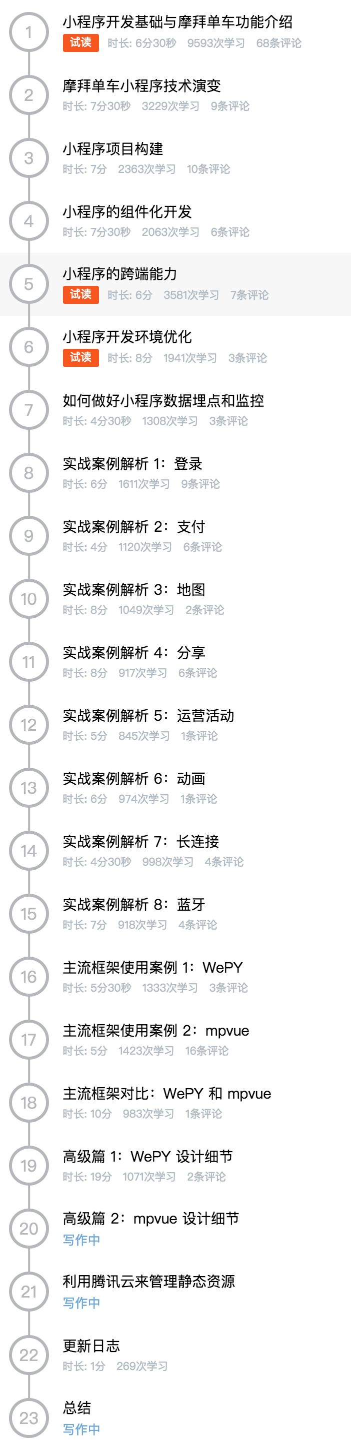 以打造内容全、技术新、可实操的小程序小册为目标,整本小册共包含 21 节,不仅讲述了小程序开发的一些基础知识,也通过摩拜单车业务案例深入小程序开发,此外,还加入了主流框架的使用对比和深入的技术细节分析。