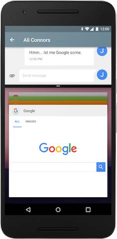 在运行 Android N 的手机和平板电脑上,用户可以并排运行两个应用,或者处于分屏模式时一个应用位于另一个应用之上。 用户可以通过拖动两个应用之间的分隔线来调整应用。