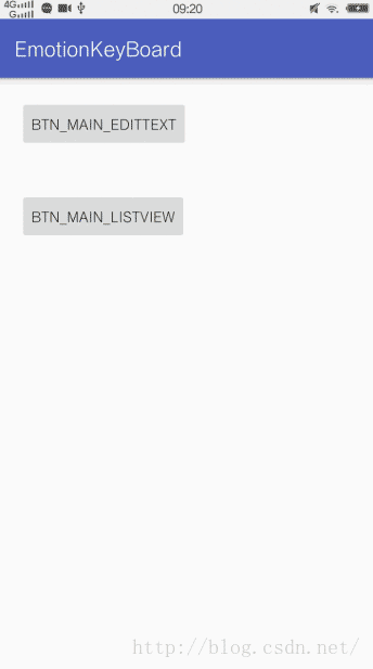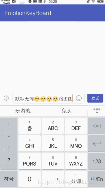最近公司在项目上要使用到表情与键盘的切换输入,自己实现了一个,还是存在些缺陷,比如说键盘与表情切换时出现跳闪问题,这个相当困扰我,不过所幸在Github(其中一个不错的开源项目(https://github.com/dss886/Android-EmotionInputDetector),其代码整体结构很不错)并且在论坛上找些解决方案,再加上我也是研究了好多个开源项目的代码,最后才苦逼地整合出比较不错的实现效果,可以说跟微信基本一样(嘿嘿,只能说目前还没发现大Bug,若发现大家一起日后慢慢完善,这里我也只是给出了实现方案,拓展其他表情我并没有实现哈,不过代码中我实现了一个可拓展的fragment模板以便大家实现自己的表情包),我只是实现了一页表情,代码我也进行另外的封装与拓展,大家需要多表情的话只需要实现自己的表情fragment界面,然后根据工厂类获取即可,废话不多说先上图看效果: