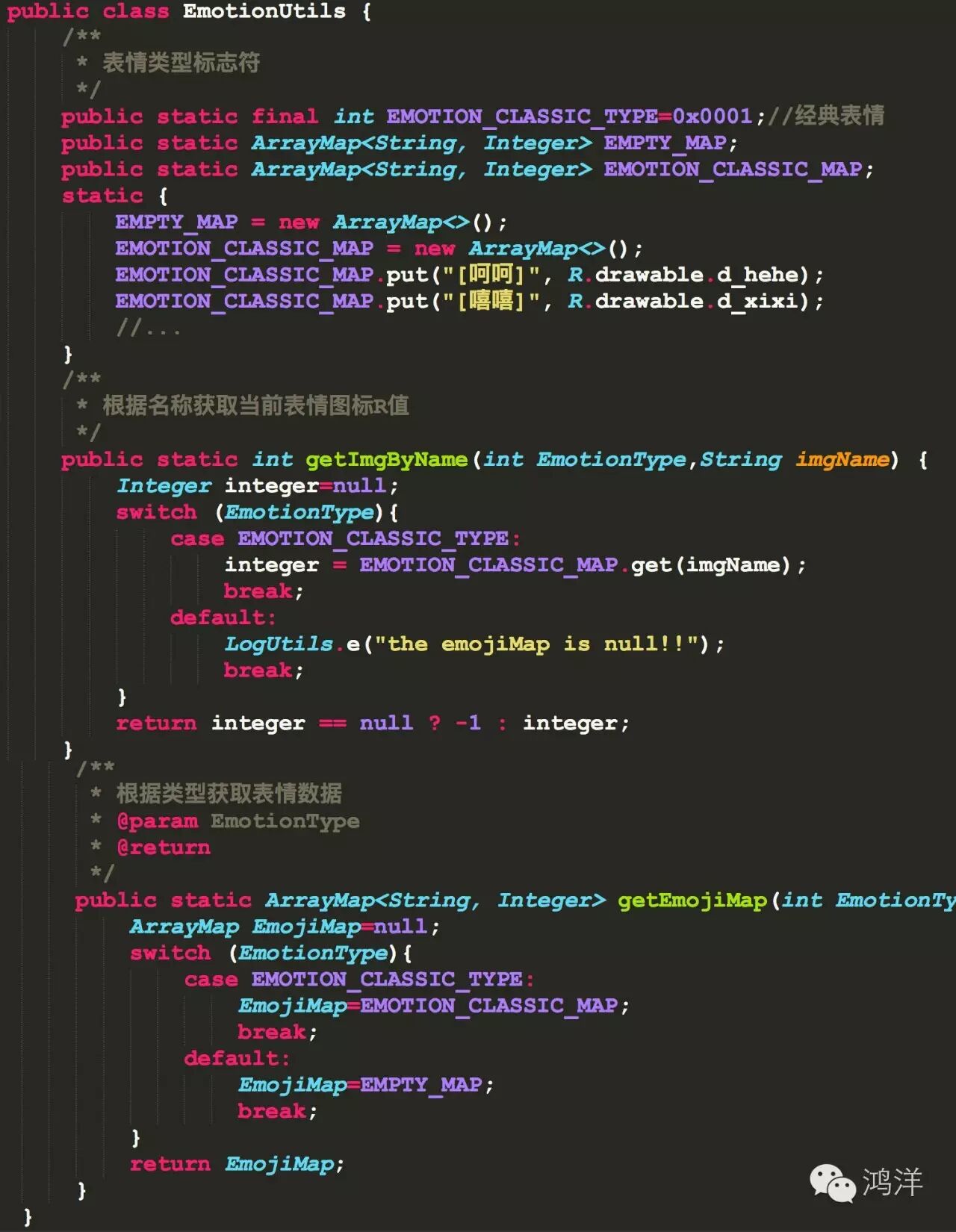 表情的显示从直观上看确实是一个图片,但实际只是一种特殊的文本(ImageSpan),比如微博里表情就是”[表情名字]”的接口,可爱的表情就是[可爱]…因此这里我们也打算利用”[表情名字]”作为key,图片的R值作为内容进行存取,EmotionUtils类如下