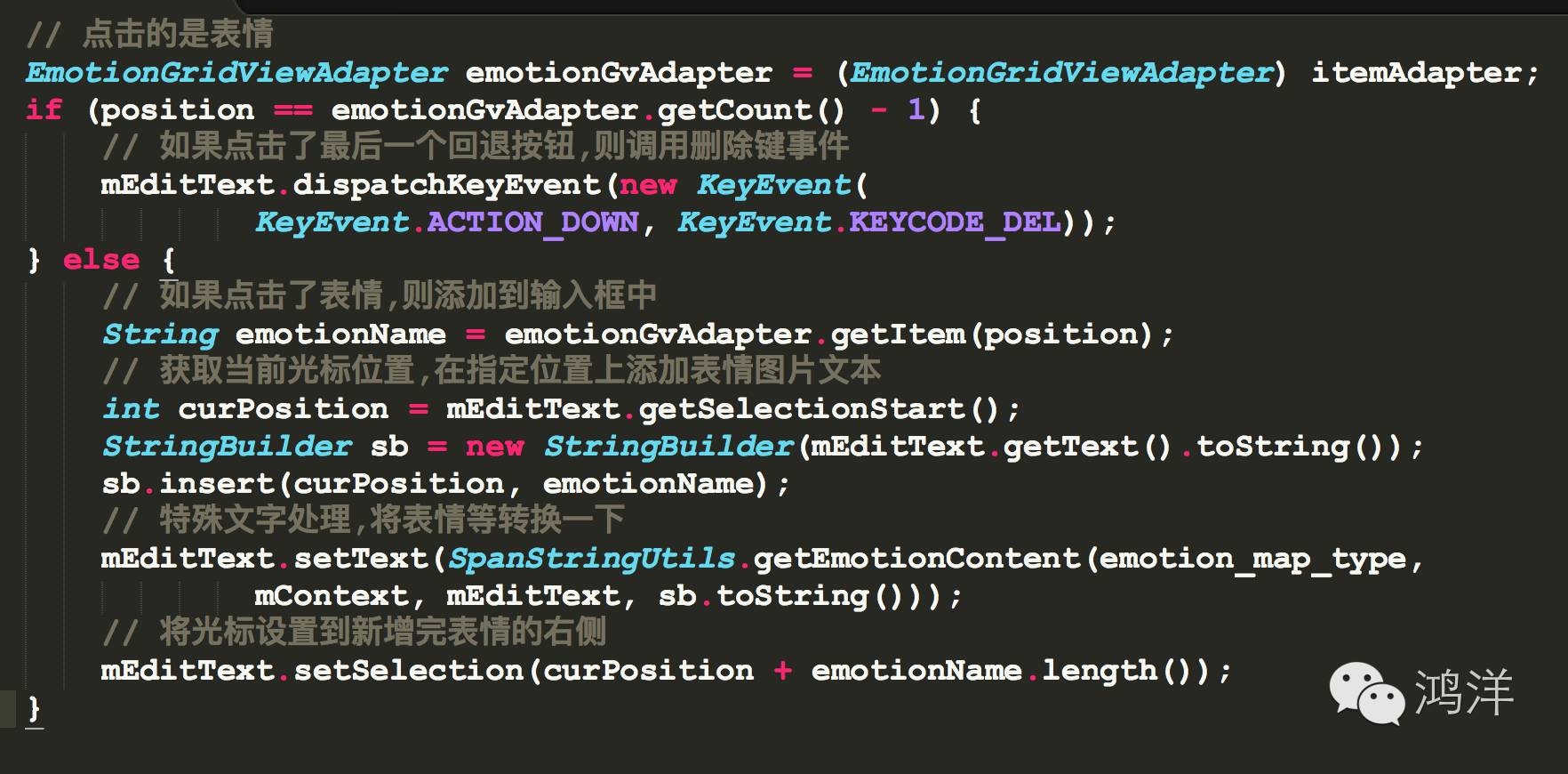 思路:在表情框输入一个表情实际上是在当前光标位置插入一个表情,添加完表情后再把当前光标移动到表情之后,所以我们首先要获取到光标到首位置,这个可以利用EditText.setSelectionStart()方法,添加完表情后要设置光标的位置到表情之后,这个可以使用EditText.setSelection(position)方法。当然如果点击的是删除按钮,那么直接调用系统的 Delete 按钮事件即可。下面直接上代码: