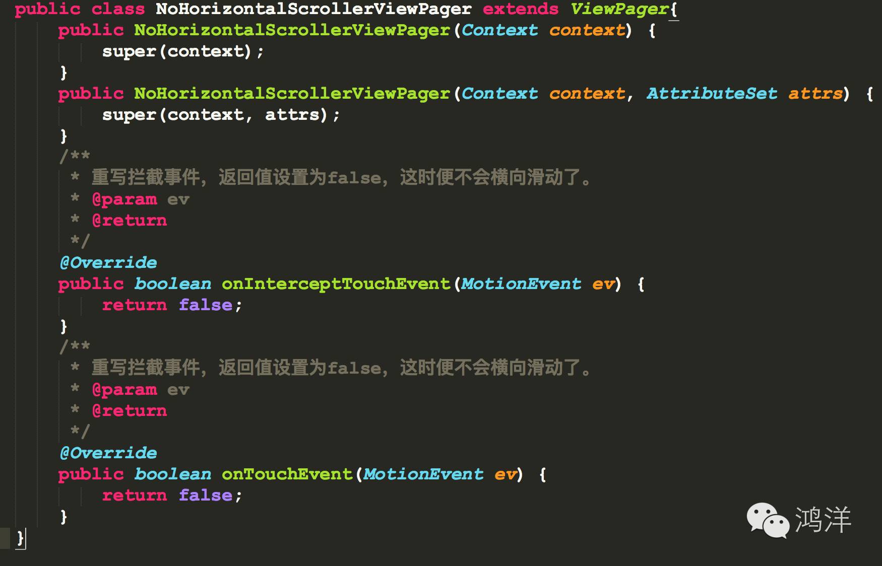 这里我们主要采用NoHorizontalScrollerViewPager+RecyclerView+Fragment实现,思路是这样的,我们以NoHorizontalScrollerViewPager作为载体,fragment作为展示界面,RecyclerView作为底部滚动条,每当点击RecyclerView的item时,我们使用viewPager.setCurrentItem(position,false)方法来切换fragment界面即可(这里传入false是表示不需要viewPager的切换动画)。这样我们就可以实现不同类表情的切换了。(提示一下这里所指的fragment其实是就工程目录中的EmotiomComplateFragment.java类)这个比较简单,就不多啰嗦了。实现代码稍后会一起提供。下面是不可横向滑动的ViewPager的实现代码,非常简单,不拦截子类事件即可。