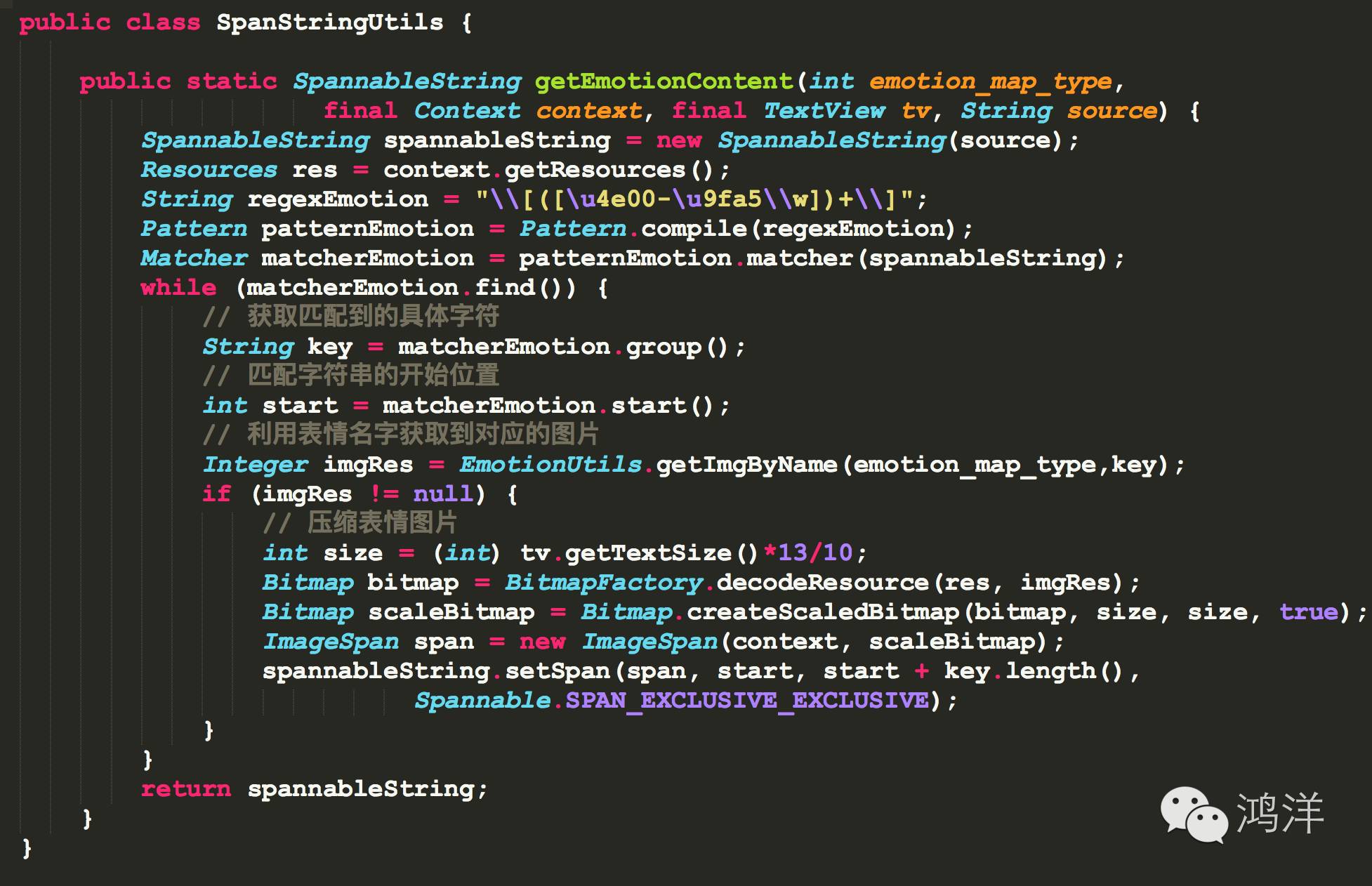 matcher.find(),代表部分匹配,从当前位置开始匹配,找到一个匹配的子串,将移动下次匹配的位置。因此我们可以通过这个方法获取到匹配的开始位置,作为setSpan的start值(如果字符串中有多个表情就会执行多次匹配)。