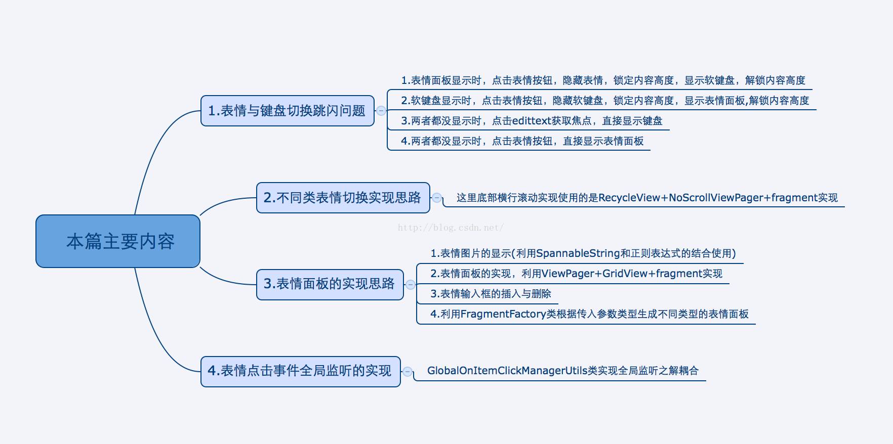 本篇主要分析的核心类EmotionKeyboard.java,EmotionComplateFragment.java,EmotionMainFragment.java,FragmentFactory.java,还有一个是工具类里的EmotionUtils.java和GlobalOnItemClickManagerUtils.java 这几个类我会重点分析一下,其他的大家自行看源码哈。