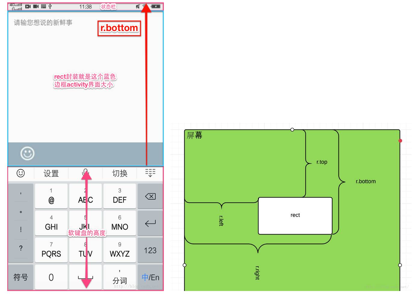 这两句其实将左图中蓝色边框( 其实也就是actvity的大小)的size大小参数封装到Rect中,以便我们后续使用。虽然计算出来的区域大小不包含状态栏,但是r.bottom(红色箭头长度)的大小是从屏幕顶部开始计算的所以包含了状态栏的高度。需要注意的是,区域大小是这样计算出来的: