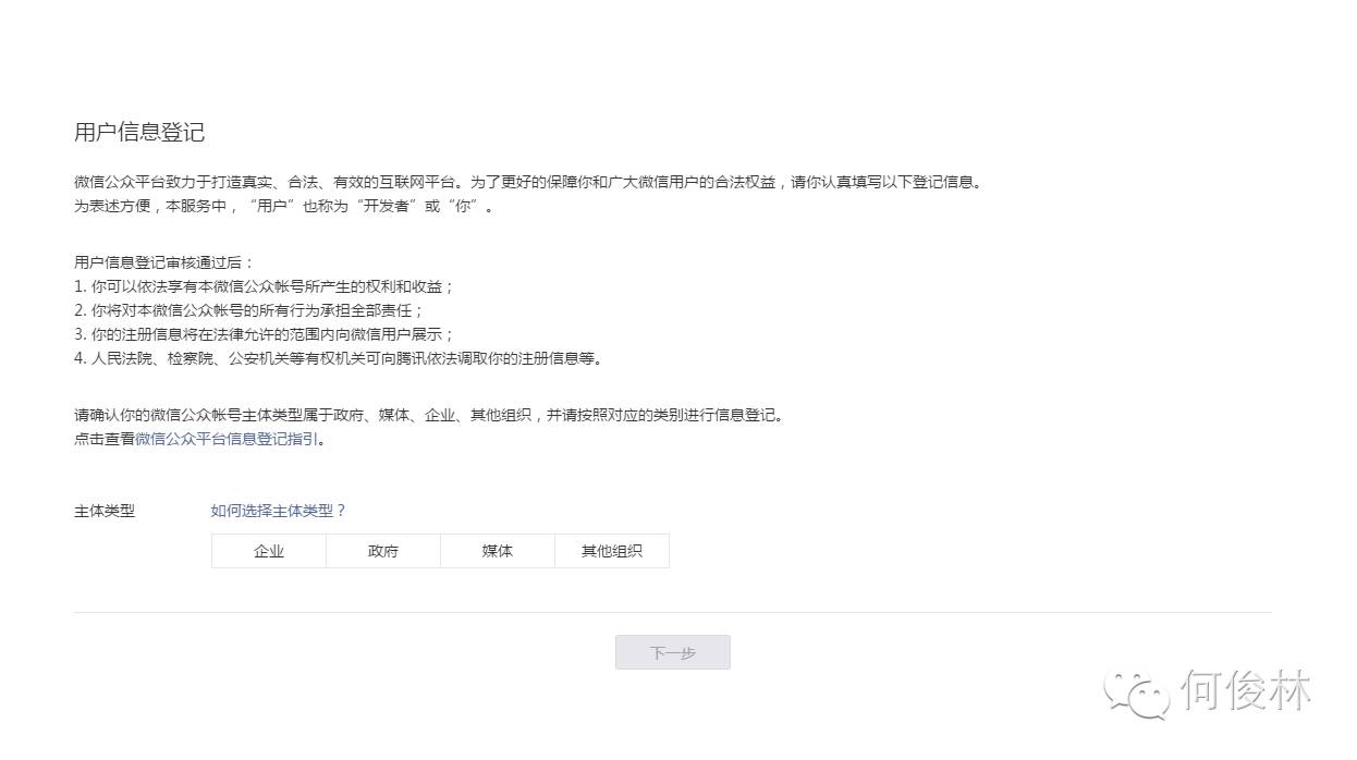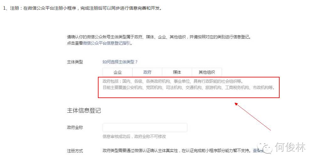 Attention:目前微信小程序仅支持企业、媒体、政府和其他组织注册,暂不支持个人注册。