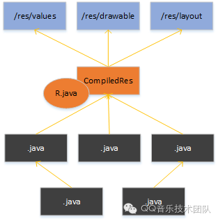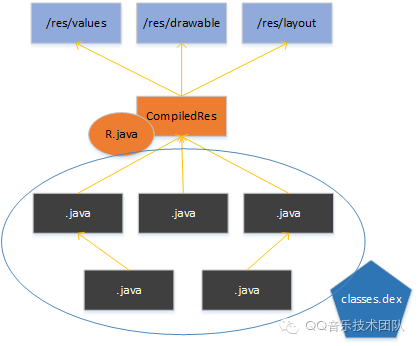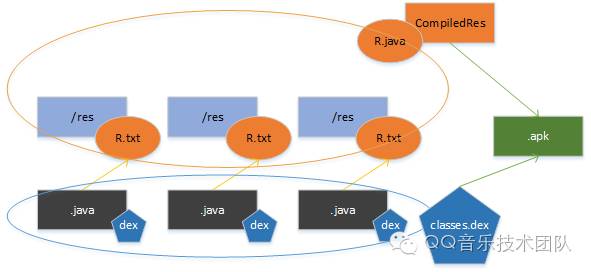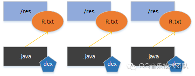 Buck工具在构建的不同阶段会生成三个重要的文件:R.txt, .jar, .apk,分别对应三种Rule:android_resource, android_library, android_binary。如果以module为单位,每个module会对应一个R.txt和.jar(如果这个module和UI元素无关,那么就没有R.txt文件),最终Buck将这些R.txt汇总成R.java文件,将.jar文件汇总成dex文件。