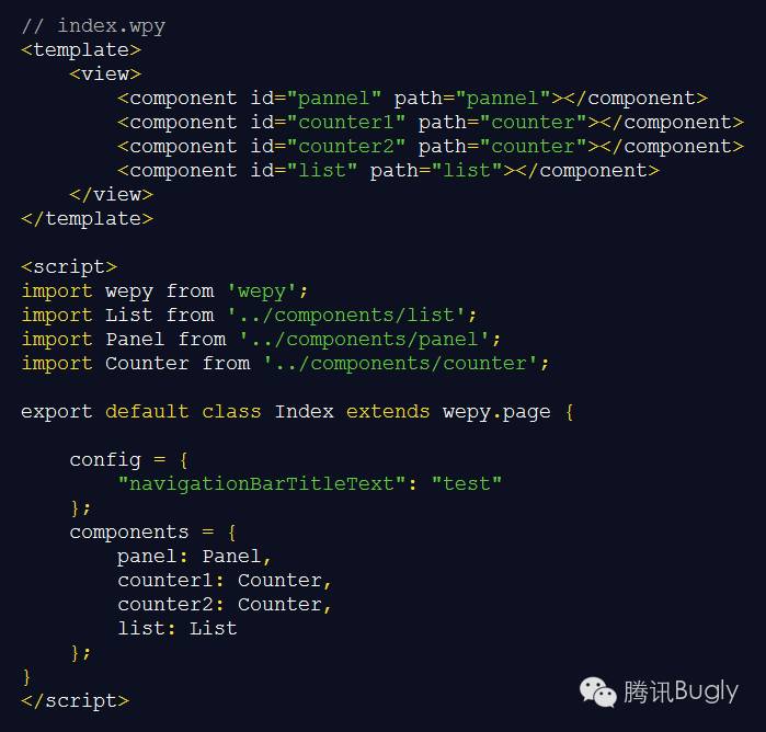 当页面或者组件需要引入子组件时,需要在页面或者script中的components给组件分配唯一id,并且在template中添加<component>标签,如index.wpy。