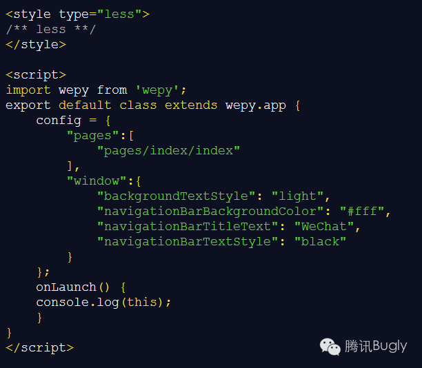入口app.wpy继承自wepy.app,包含一个config属性和其全局属性、方法、事件。其中config属性对应原有的app.json,编译时会根据config生成app.json文件,如果需要修改config中的内容,请使用系统提供API。