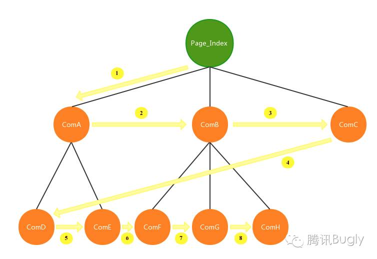 $broadcast事件是由父组件发起,所有子组件都会收到此广播事件,除非事件被手动取消。事件广播的顺序为广度优先搜索顺序,如上图,如果Page_Index发起一个$broadcast事件,那么接收到事件的先后顺序为:A, B, C, D, E, F, G, H。如下图:$emit