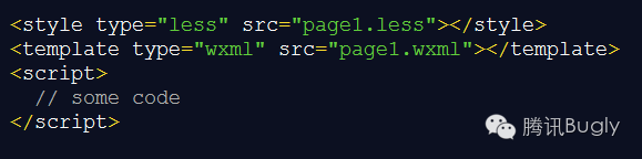 其中入口文件app.wpy不需要template,所以编译时会被忽略。这三个标签都支持type和src属性,type决定了其代码编译过程,src决定是否外联代码,存在src属性且有效时,忽略内联代码,示例如下: