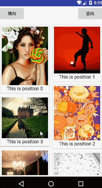 说明:通过按钮监听设置布局方向,关联不同的item布局,加载不同的数据。其它的都没有啥需要说的。
