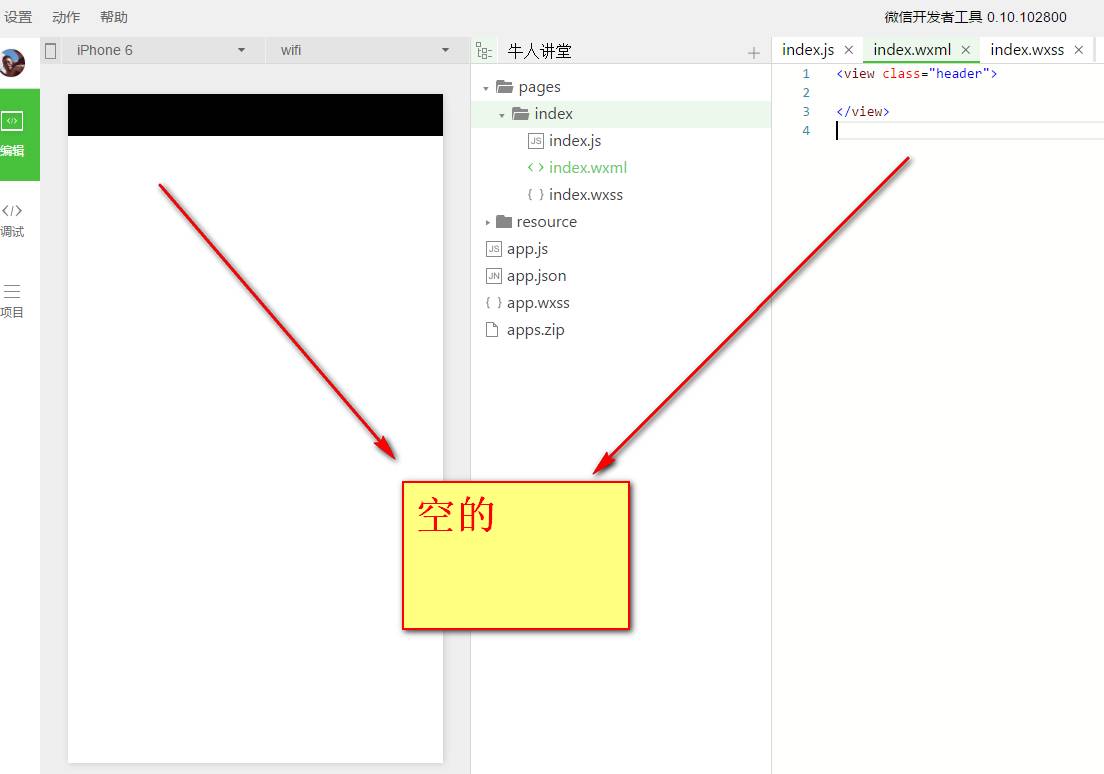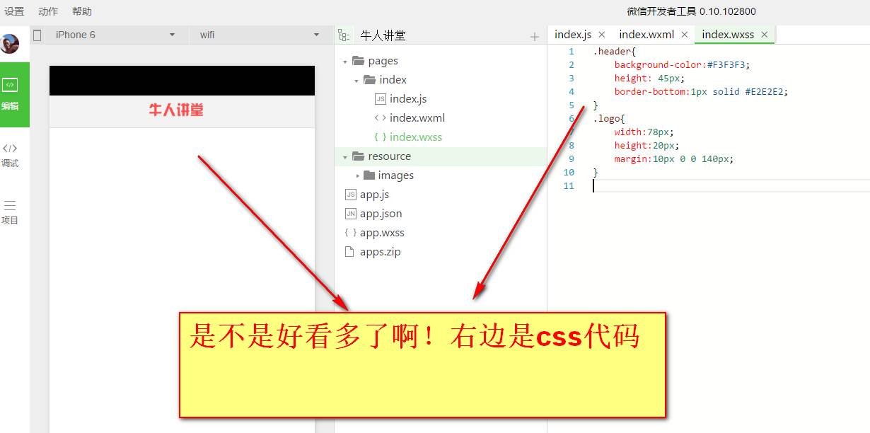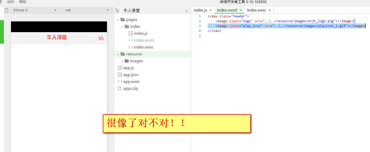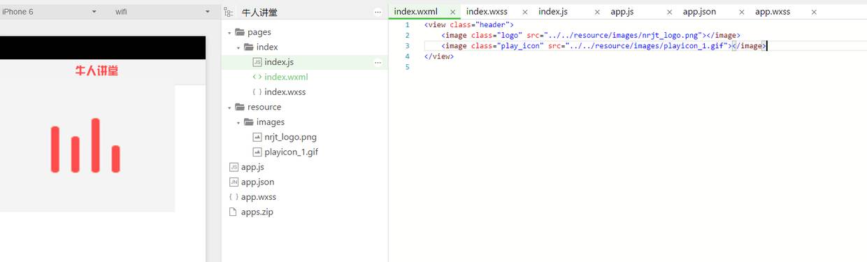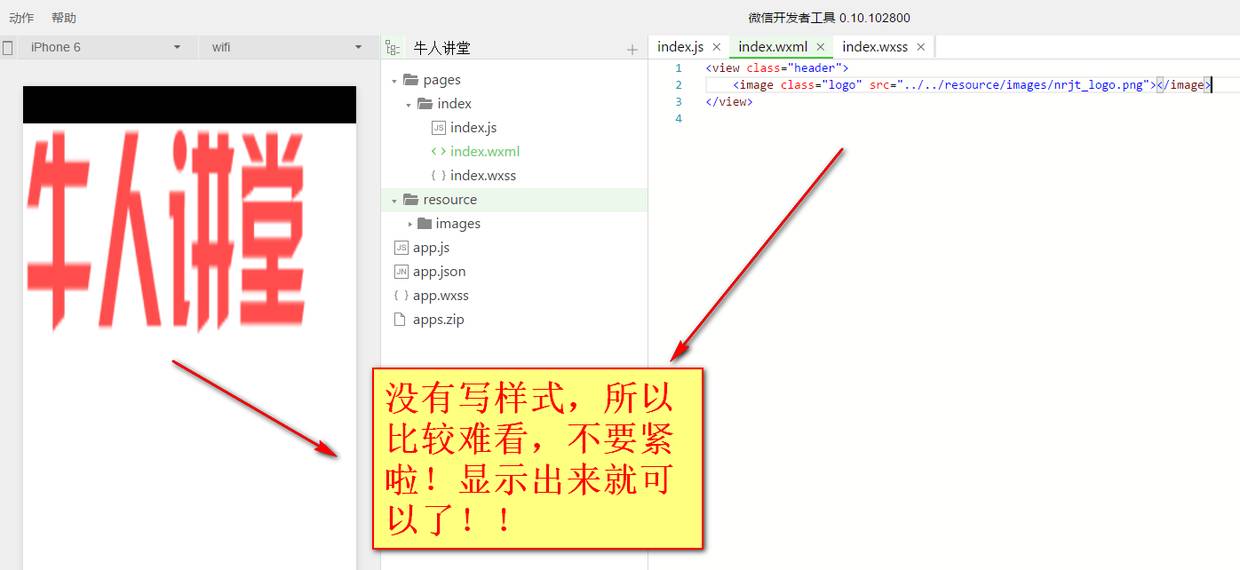 我们还是换回本地的牛人讲堂的logo图片。可以看到,logo的图片的宽度是全屏的宽度,高度也不符合要求。所以我们要调整图片的大小等样式来符合我们的要求,这就需要用到wxss了,wxss的作用就是调整组件的样式,让wxml中的组件更精美。