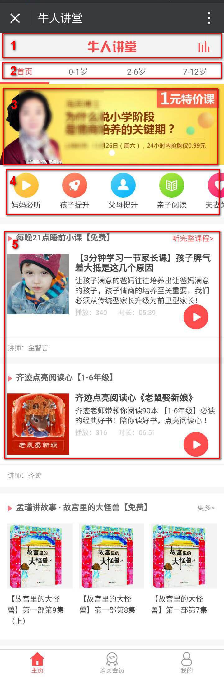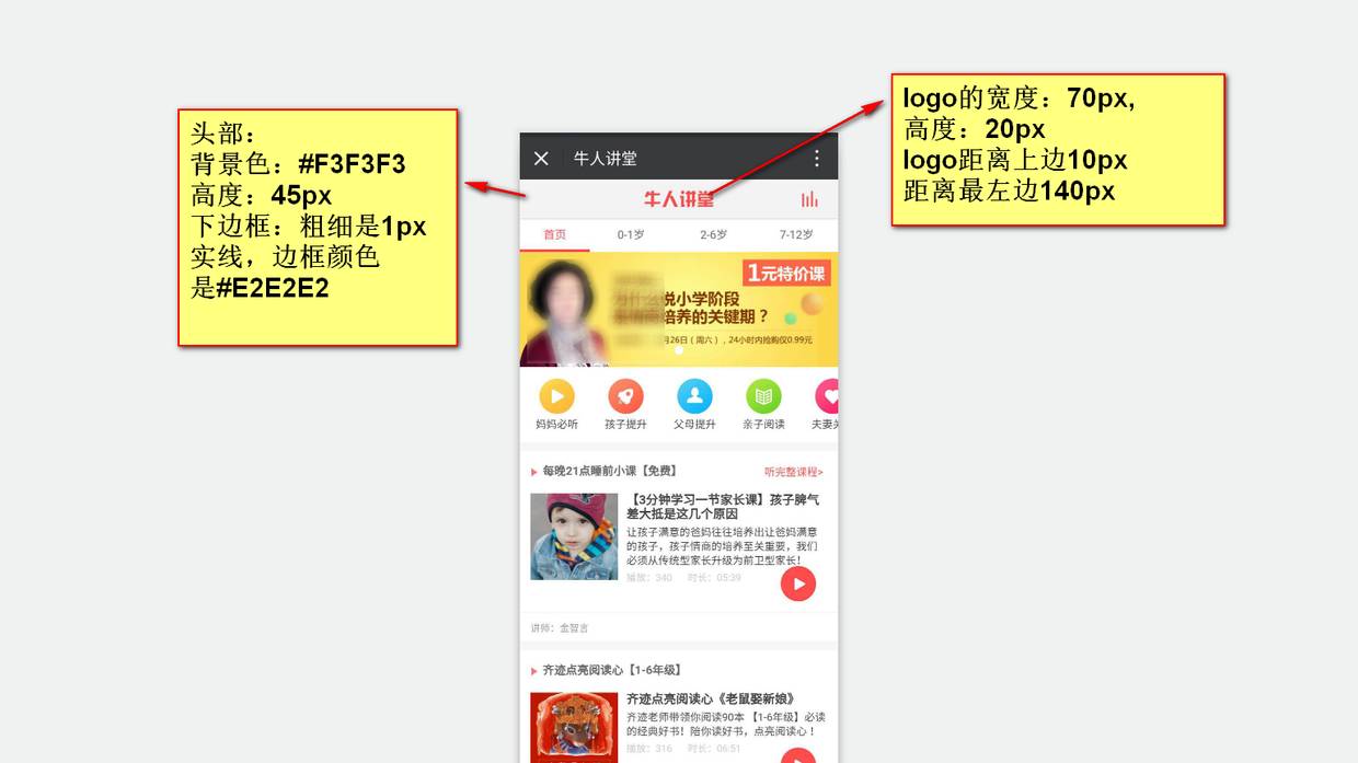 这个页面由5部分组成,最上面是标题部分,包括中间的“牛人讲堂”的logo和最右边的播放效果小图标。其次是一个分类tab,可以互相切换,并且切换后,显示红色底边。