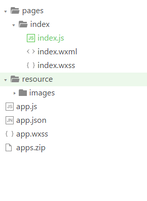 当然,你也可以不命名为resource,其他的名字也可以,但是尽量要符合实际开发的意义,能让人看一眼就晓得这个文件夹的实际意义,这也是一个好的开发习惯。弄好以后,我们再来看下本地的小程序的文件结构。