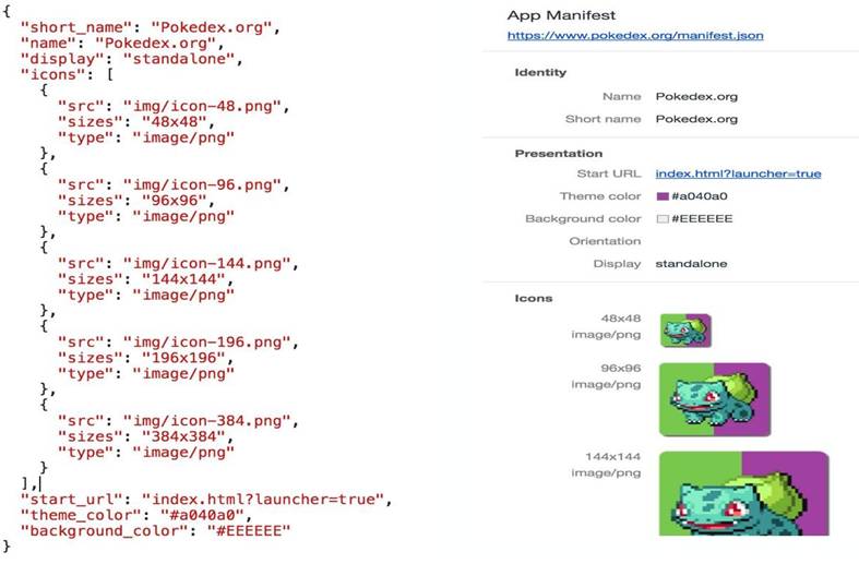 Web App Manifest以JSON的格式定义Web应用的相关配置(应用名称、图标或图像连接、启动URL、自定义特性、启动默认配置、全屏设置等)。