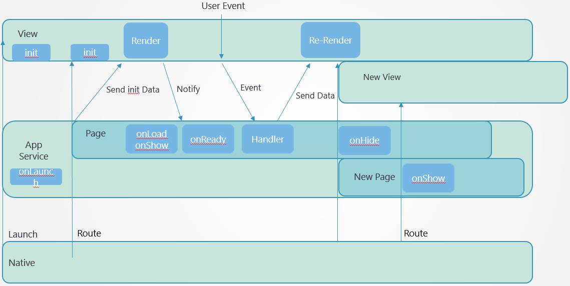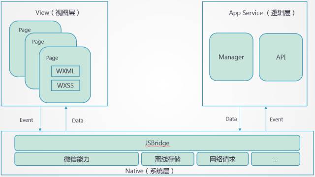 视图层和逻辑层通过系统层的JSBridage进行通信,逻辑层把数据变化通知到视图层,触发视图层页面更新,视图层把触发的事件通知到逻辑层进行业务处理。