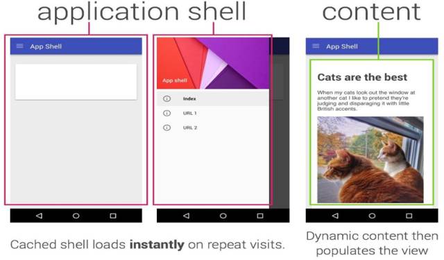 App Shell(应用外壳)是应用的用户界面所需的最基本的 HTML、CSS 和 JavaScript,首次加载后立刻被缓存下来,不需要每次使用时都被下载,而是只异步加载需要的数据,以达到UI保持本地化。