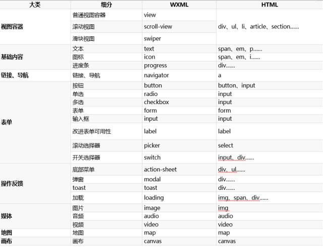 小程序提供了一系列组件用于开发业务功能,按照功能与HTML5的标签进行对比如下: