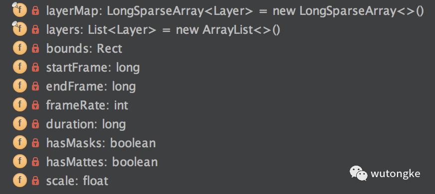 我们看下LottieComposition都有哪些成员变量,这些成员变量描述了After Effects中的动画。