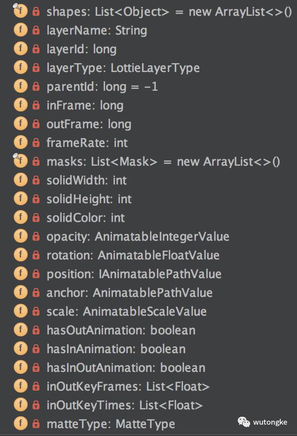 可以看到startFrame、endFrame、duration、scale等都是动画中常见的。我们看下List<Layer>,看名字就是映射拆分后的图层数据: