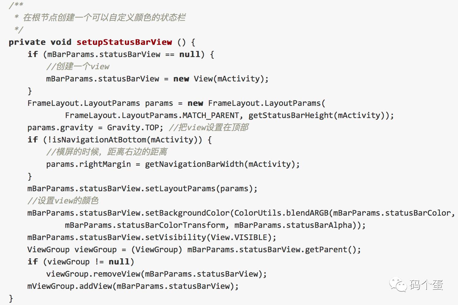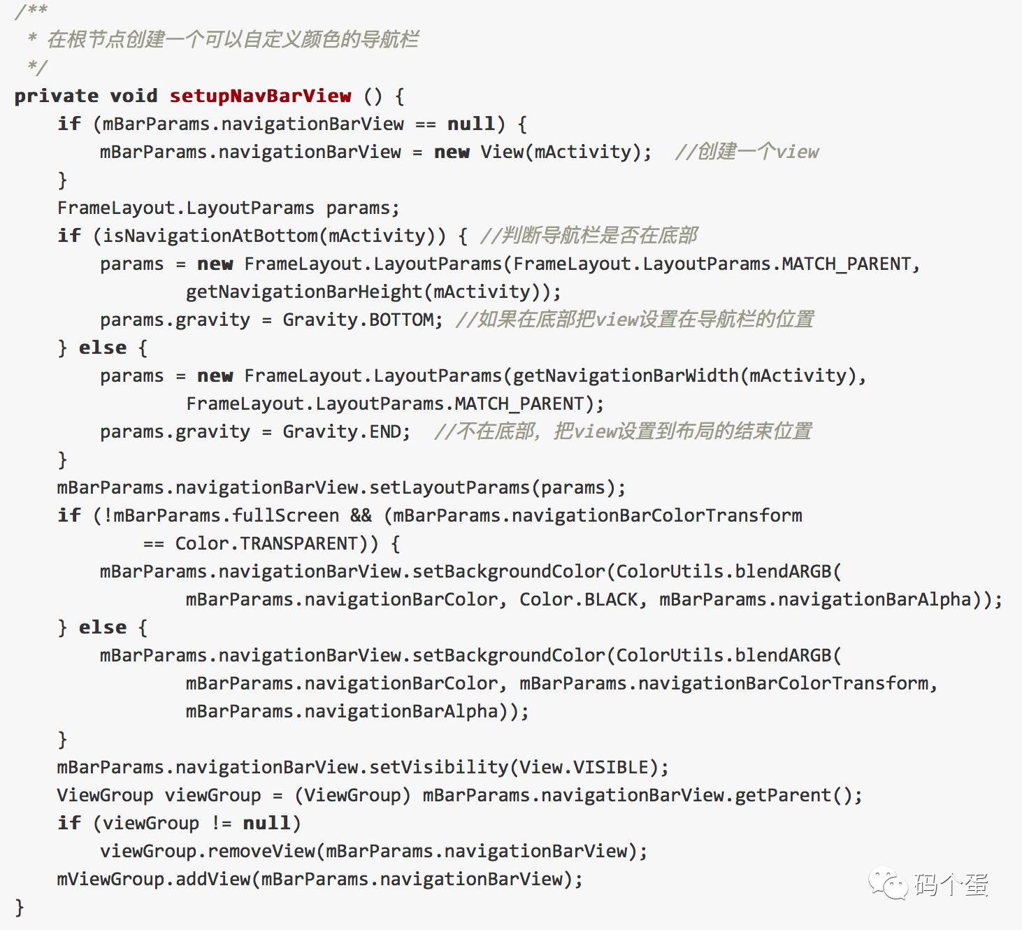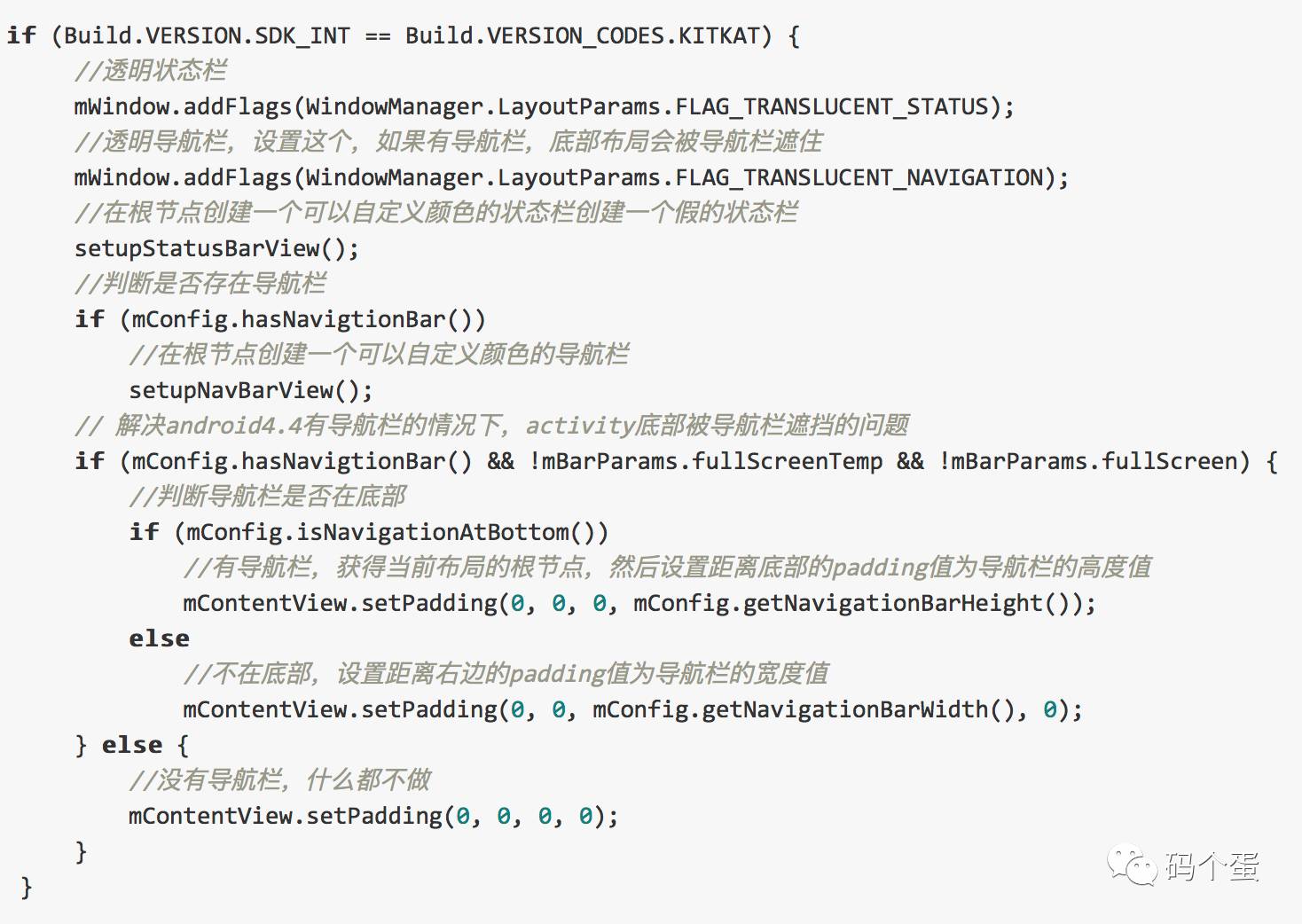 在4.4里就没有5.0以上这些api了,只能设置透明状态栏和导航栏,而且设置透明导航栏之后,底部布局会被导航栏遮住,那怎么办呢?好吧,只能自己写代码去实现啦。再说之前,说说我的一个思路吧。现在是2.x.x版本,在1.x.x版本的时候,4.4中实现沉浸式是引用大家非常熟悉的一个库SystemBarTint(不推荐使用了,很久没人维护了)来实现的,但是后来发现一个严重的问题,对于有导航栏的手机,设置导航栏颜色的时候,底部布局会被导航栏遮住,除此之外还有一个小问题就是当用户设置状态栏为透明色的时候,不能时刻改变bar的颜色值,are you kidding?既然出现这样的问题,就想着怎么去解决吧!就这样,我乖乖去看看SystemBarTint的源代码,哦!原理如此,发现SystemBarTint库的实现就是在状态栏和导航栏的位置自定义了可以改变背景颜色的view,然后通过window.getDecorView()得到根布局,把刚才创建的view添加进去,既然这样,为何不自己也写一个,顺便把刚才说到导航栏的问题也解决一下呢。解决方法如下代码,在这里通过注释的方法向大家说明。这里代码只是片段,不可以直接拷贝到自己的项目中