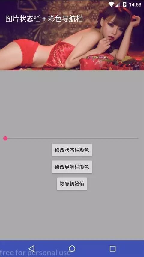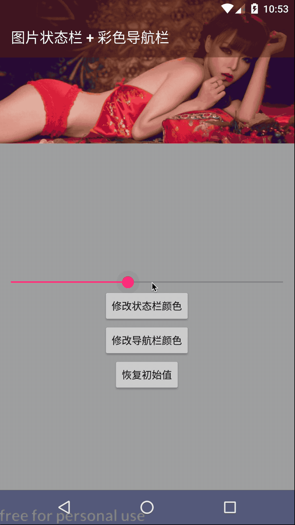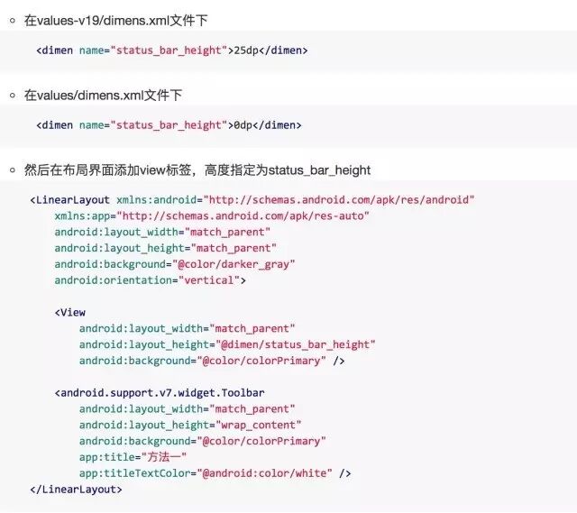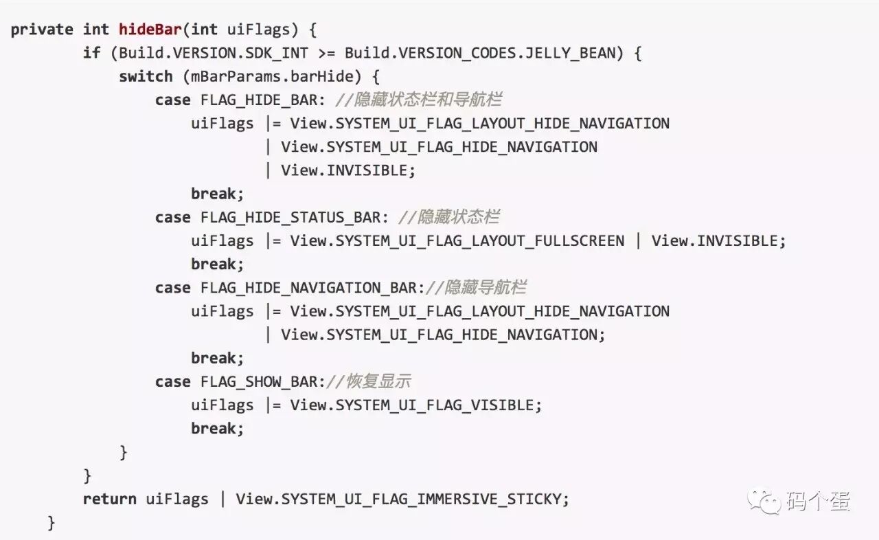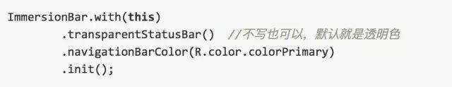在4.4里就没有5.0以上这些api了,只能设置透明状态栏和导航栏,而且设置透明导航栏之后,底部布局会被导航栏遮住,那怎么办呢?好吧,只能自己写代码去实现啦。再说之前,说说我的一个思路吧。现在是2.x.x版本,在1.x.x版本的时候,4.4中实现沉浸式是引用大家非常熟悉的一个库SystemBarTint(不推荐使用了,很久没人维护了)来实现的,但是后来发现一个严重的问题,对于有导航栏的手机,设置导航栏颜色的时候,底部布局会被导航栏遮住,除此之外还有一个小问题就是当用户设置状态栏为透明色的时候,不能时刻改变bar的颜色值,are you kidding?既然出现这样的问题,就想着怎么去解决吧!就这样,我乖乖去看看SystemBarTint的源代码,哦!原理如此,发现SystemBarTint库的实现就是在状态栏和导航栏的位置自定义了可以改变背景颜色的view,然后通过window.getDecorView()得到根布局,把刚才创建的view添加进去,既然这样,为何不自己也写一个,顺便把刚才说到导航栏的问题也解决一下呢。解决方法如下代码,在这里通过注释的方法向大家说明。这里代码只是片段,不可以直接拷贝到自己的项目中