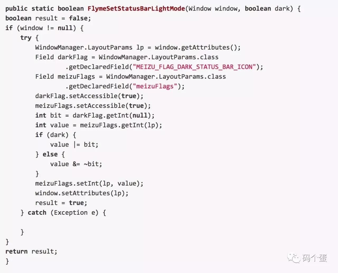 }但是对于一些第三方rom包来说,系统api就没办法实现了,还好小米和魅族公开了各自的实现方法,如下: