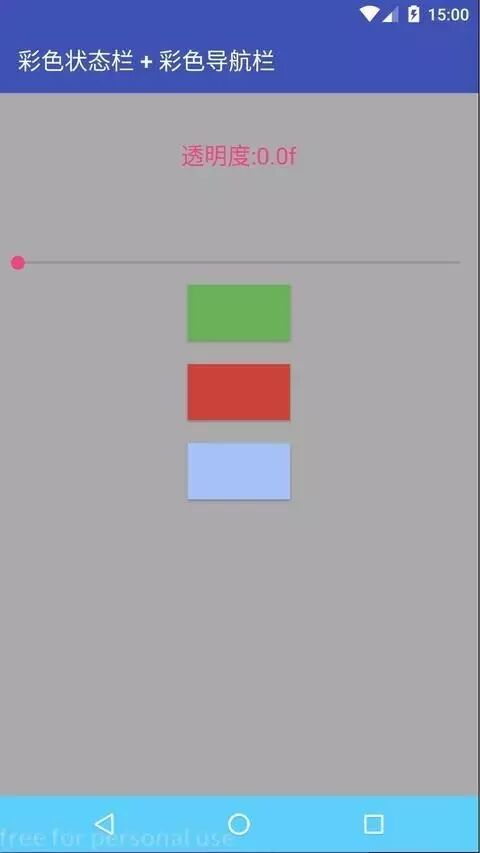 Android自5.0起,为我们提供了设置状态栏和导航栏颜色的API,我们可以自己设置状态栏和导航栏的颜色。本框架在android5.0以上就是采用官方api完成的,网上关于5.0以上的实现基本都是这样,在这里就不多说了,在这里只说一点,就是设置颜色的时候不是直接填入开发者传入的颜色值,而是采用v4包下的ColorUtils.blendARGB()方法来设置,为什么这样设计呢?有些app的状态栏并不是和标题栏颜色相同,稍微有些色差,所以在这里开发者只需要通过blendARGB()设置透明度就可以形成这种色差,而且还可以指定两种颜色之间的色差值,方便大家,android4.4上亦是如此。请看以下代码:
