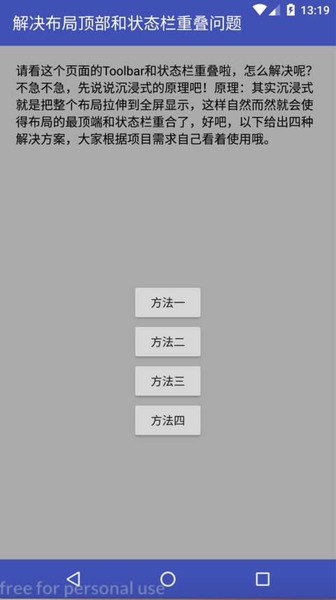 上面已经说了,沉浸式原理就是使整个布局延伸到状态栏和导航栏,既然这样必然导致一个问题,就是状态栏和布局顶部重叠,直接看图