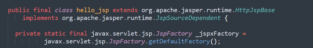 可以发现转换后的 hello_jsp 类继承自 HttpJspBase ,其实 HttpJspBase 类是继承自 HttpServlet 的,我们可以查看 TomCat 源码,所以 hello_jsp 类间接继承了 HttpServlet ,也就是说,JSP 容器将 JSP 文件装换成了一个 Servlet。