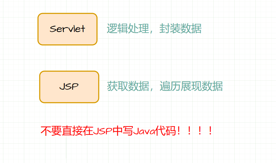 在 Servlet 中,我们使用 write 对象向浏览器写数据,html 标签可以作为字符串传入 write() 方法中。但是,当向页面写出大量数据时,代码显得十分的混乱不堪,并且后期后期维护成本极大。而 JSP 就结局了这个问题,在 JSP 代码中可以直接使用 html 标签,动态数据也可以使用 Java 代码展示,大大的简化了开发,避免了在 Servlet 中直接输出 html 标签。