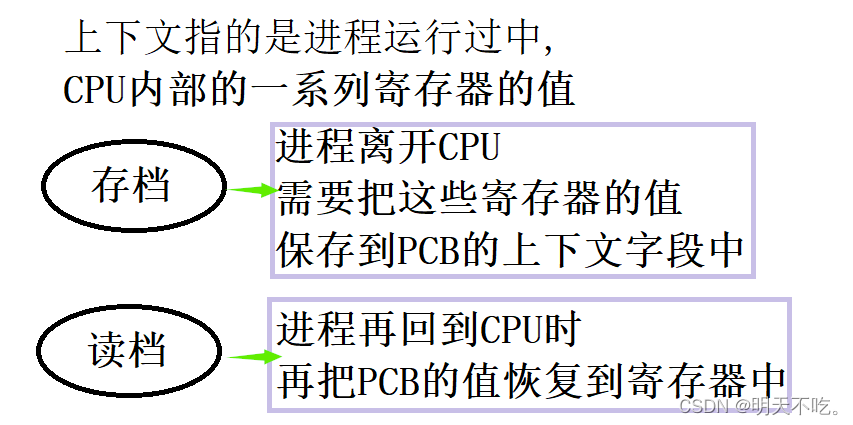 即描述当前进程执行到哪里的"存档记录",进程在暂时离开CPU时把当前运行的中间结果进行"存档",等下次进程回到CPU执行时,恢复之前的"存档",从上次的结果继续往后执行(即记录离开结果,这样回来时我可以从离开的地方继续执行)具体过程如下: