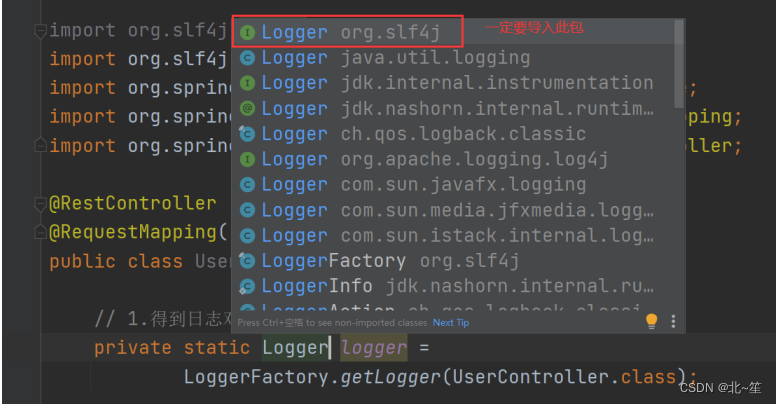 private static Logger logger = LoggerFactory.getLogger(UserController.class);注意:Logger 对象是属于 org.slf4j 包下的,不要导入错包。
