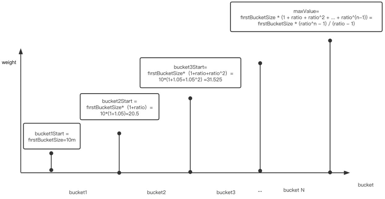 算出指数直方图的 P95,P90,P50 对应 bucket 的起始值就是推荐值(设为 estimation95,estimation90,estimation50),但这其实不是最终的推荐值