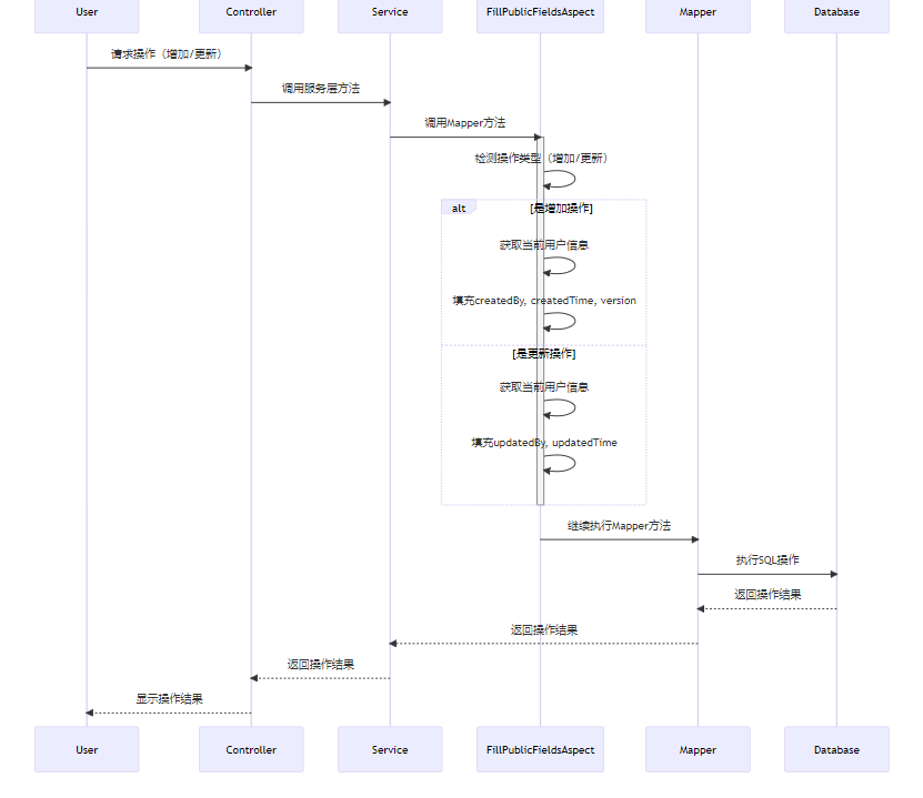 FillPublicFieldsAspect判断操作类型,如果是增加操作,则获取当前用户信息并填充createdBy、createdTime和version字段;如果是更新操作,则填充updatedBy和updatedTime字段。