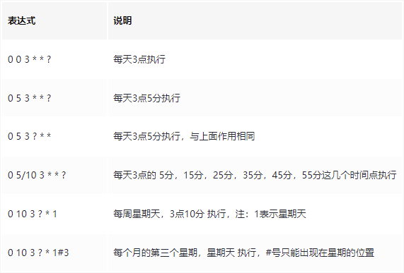 cron中,还有一些特殊的符号,含义如下: ( )星号:可以理解为每的意思,每秒,每分,每天,每月,每年... (?)问号:问号只能出现在日期和星期这两个位置。 (-)减号:表达一个范围,如在小时字段中使用“10-12”,则表示从10到12点,即10,11,12 (,)逗号:表达一个列表值,如在星期字段中使用“1,2,4”,则表示星期一,星期二,星期四 (/)斜杠:如:x/y,x是开始值,y是步长,比如在第一位(秒) 0/15就是,从0秒开始,每15秒,最后就是0,15,30,45,60 另: /y,等同于0/y