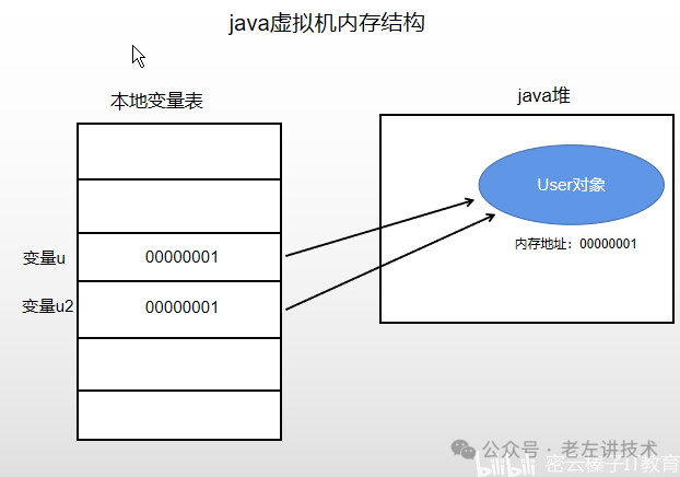 之后 User u2 = u, 将u赋值给变量u2, 也就是将00000001 赋值给u2。这样,变量u、u2指向的就是同一个对象。