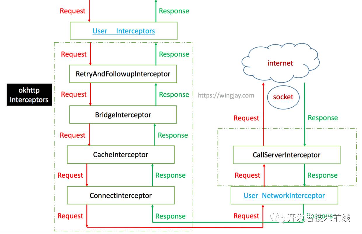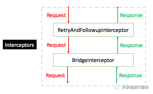 如何区分这两个呢?举个例子,我创建两个LoggingInterceptor,分别放在interceptors层和NetworkInterceptor层,然后访问一个会重定向的URL_1,当访问完URL_1后会再去访问重定向后的新地址URL_2。对于这个过程,interceptors层的拦截器只会拦截到URL_1的request,而在NetworkInterceptor层的拦截器则会同时拦截到URL_1和URL_2两个request。具体原因可以看上面的图。