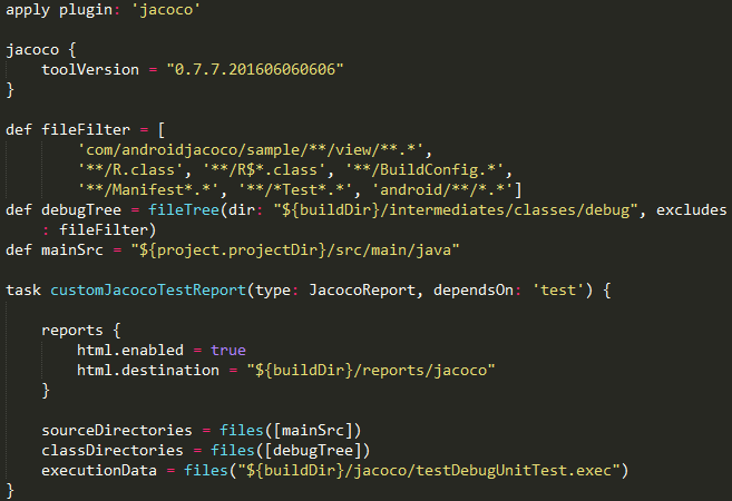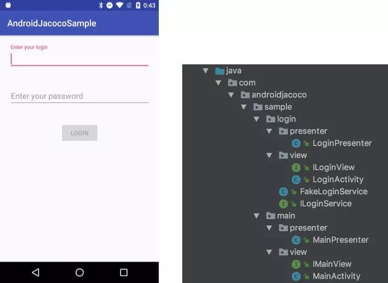 在这个示例工程中我实现了一个很基础的 MVP 模式。这意味着我们将 Activities 视为被动的 View,所有有用的 UI 逻辑放在 Presenters 中。让我们仔细看下 LoginPresenter,它有一个键盘输入处理,登录和密码的校验,以及授权逻辑本身。如果一切校验没有问题的话,那么登录成功后我们就进入 MainActivity。在 LoginPresenterTest 中有一些单元测试。MVP 模式的规则是保持 View 层拥有尽可能少的代码,同时,将业务逻辑保留在 Presenters 中,从而使得这部分逻辑代码能够很容易被单元测试覆盖到。我们将按这种方式来配置 JaCoCo。我们将忽略 View 层和一些 Android 相关的类,为除此以外其他的类的代码生成测试覆盖报告。