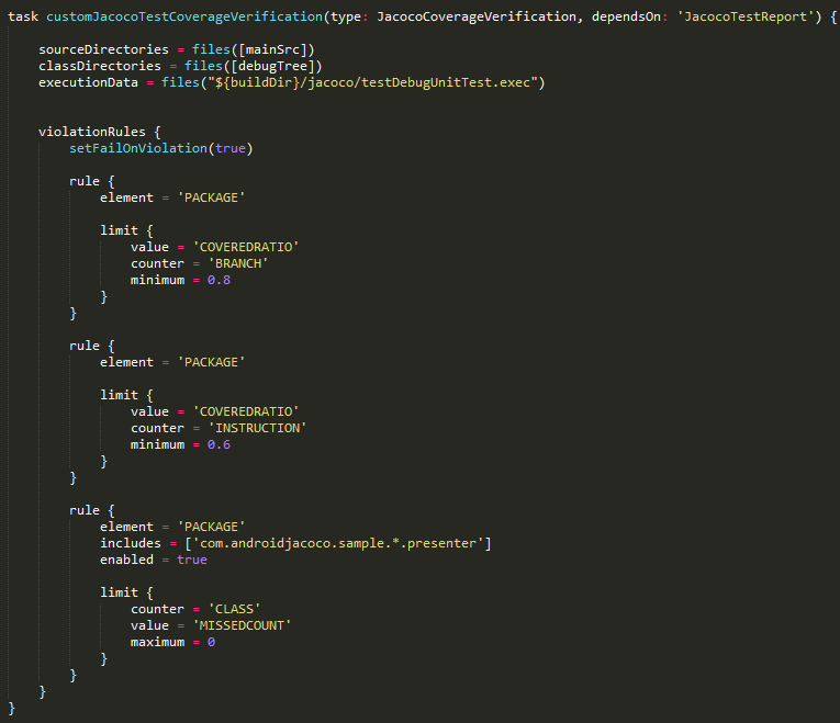 这个 task 依赖于前面的 customJacocoTestReport task,如果执行它,将会首先生成测试覆盖报告然后接着对其进行分析。这个 task 的配置中包含如何找到源代码类所在的路径,以及 violationRules 配置块。violationRules 配置块本身又包含了一些规则块,只要你愿意,你可以添加尽可能多的这种规则块。在这个例子中,我配置了三个规则块: